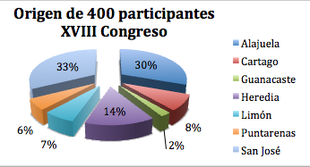 En las estadísticas, aparece San José a la cabeza con 130 participantes, muy predecible al realizarse en San Pedro; le sigue de cerca de segundo, el grupo de Alajuela, con 122 participantes. De tercero está el grupo de Heredia con 57 participantes, seguido por Cartago, con 33 participantes. Siguen 26 participantes de Limón, 23 de Puntarenas y 9 de Guanacaste, para un total de 400 participantes inscritos en el XVIII Congreso.
