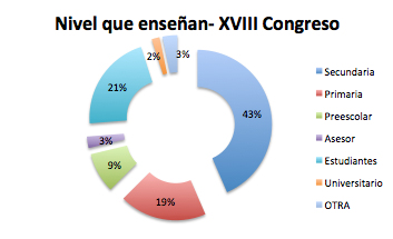 Como en el pasado, el grupo mayoritario es de secundaria con 174 docentes. Ese resultado está muy ligado a los encadenamientos de comunicación del mismo Ministerio de Educación, donde los Asesores Nacionales y Regionales de Ciencias y Estudios Sociales cumplen una función fundamental en la promoción del congreso entre profesores de secundaria.