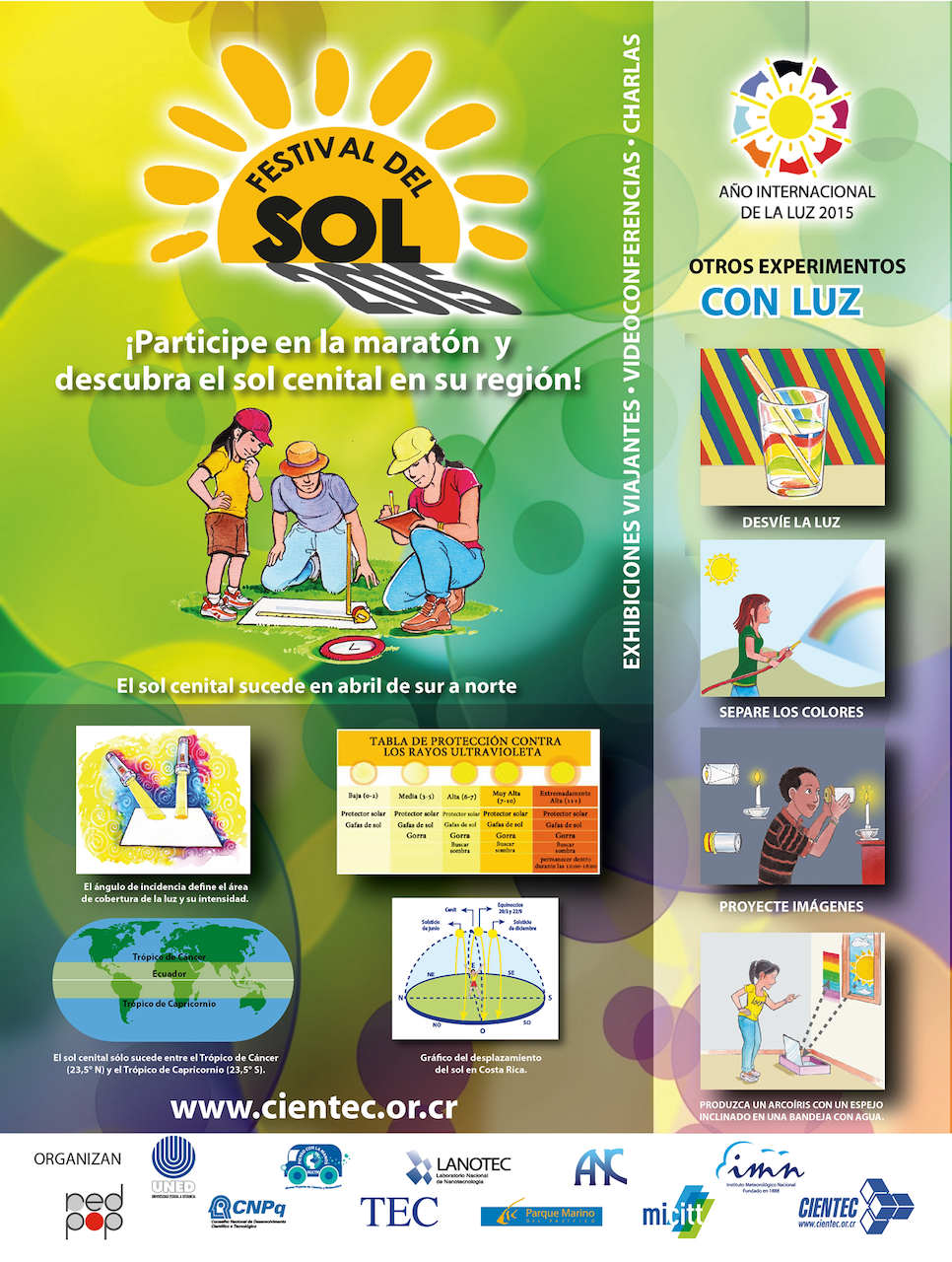 Campaña de ciencia ciudadana, abril 2015. Entre el 10 y el 18 de abril, se realizó una estrategia colectiva para observar la inclinación de las sombras y determinar el momento de Sol cenital en las diferentes latitudes del país, empezando por el extremo sur y terminando en el norte (latitudes 8-11°'15'N). Se inscribieron 99 grupos y finalmente contribuyeron 30 con fotos y datos. Participaron grupos de adultos, familias, Scouts y centros educativos desde Ciudad Neily y Golfito hasta Santa Cruz y Los Chiles. Esta actividad fue organizada conjuntamente por CIENTEC, MICITT, UNED, LANOTEC, Academia Nacional de Ciencias, Instituto Meteorológico Nacional, TEC, Parque Marino del Pacífico y Museo Viajante de ciencias y matemática, como parte del “Año Internacional de la Luz 2015” y el “Festival del Sol”.