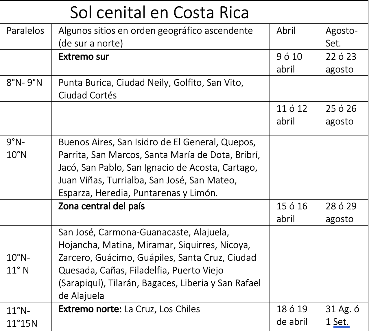 - Se recomienda practicar varios días antes de la fecha prevista para su localidad del sol cenital. (Ver tabla abajo.) Recuerde que el Sol cenital se dará solo un momento, para un mismo sitio en abril y no se repetirá hasta agosto (Costa Rica).