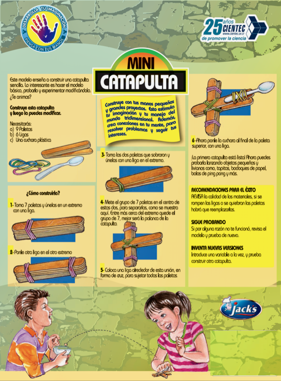 Desarrolla tu ingenio: piensa con las manos. Este modelo te enseña a crear una catapulta sencilla. Lo interesante es hacer el modelo básico, probarlo y luego experimentar modificándolo. ¿Te animas?