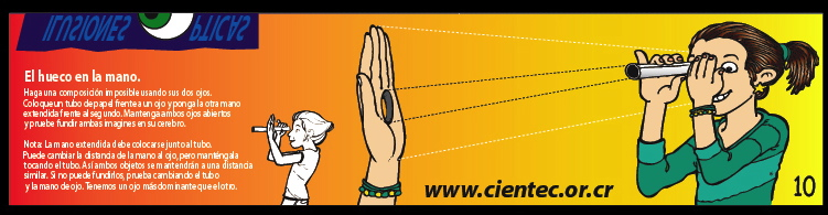 Puede cambiar la distancia de la mano al ojo, pero manténgala tocando el tubo. Así ambos objetos se mantendrán a una distancia similar. Si no puede fundirlos, prueba cambiando el tubo y la mano de ojo. Tenemos un ojo más dominante que otro. Si no consigue ver la ilusión, no se de por vencida, siga probando.