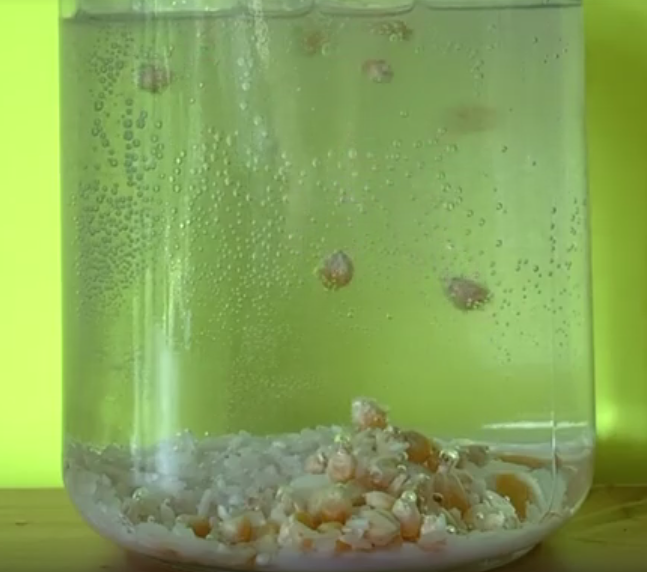 ¿Qué sucede? Se forman burbujas de gas, de dióxido de carbono, que se adhieren a la superficie de las palomitas y las impulsan a subir y flotar. Las palomitas sirven como naves para el gas y ascienden hasta que se liberan de suficientes burbujas para caer de nuevo, descender y cargarse de nuevas burbujas de gas y flotar.