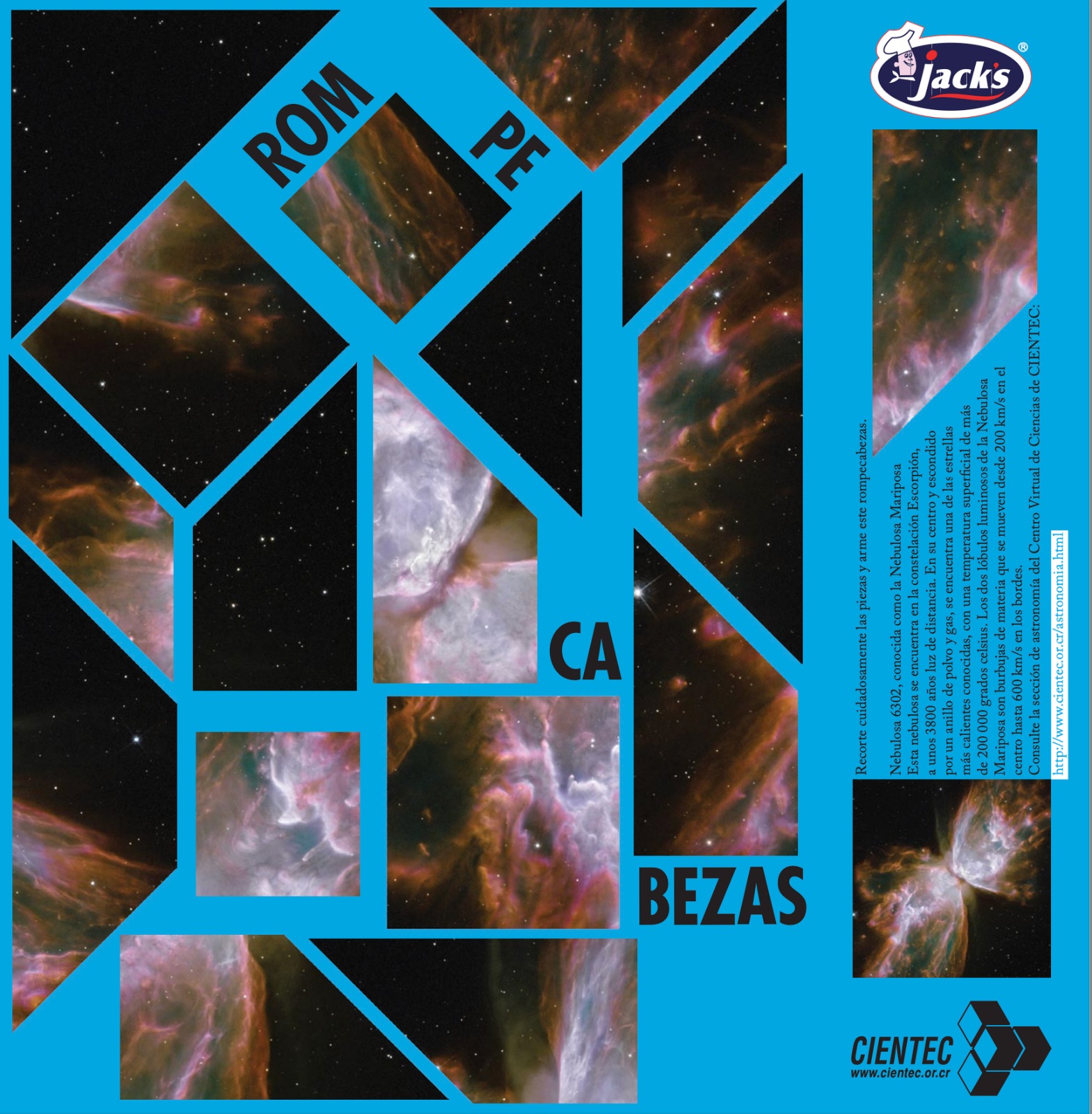 Como parte de una campaña lúdica en las cajas de cereal de Alimentos Jacks's en el 2011, se crearon 4 rompecabezas de objetos celestes. Esta es la versión de la Nebulosa 6302, conocida como la Mariposa. Puede descargar la imagen, imprimirla y armar su rompecabezas. Disfrute del reto.
