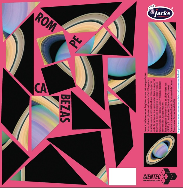 Como parte de una campaña lúdica en las cajas de cereal de Alimentos Jacks's en el 2011, se crearon 4 rompecabezas de objetos celestes. Este de Saturno tuvo mucha aceptación. Puede descargar la imagen, imprimirla y armar su rompecabezas. Disfrute del planeta visto en ultravioleta.