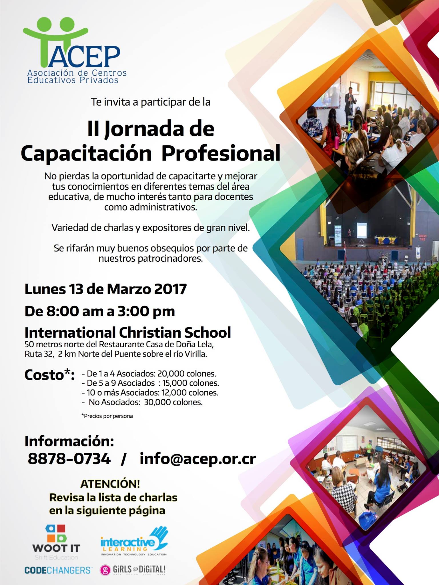 Más información: Tel. 8878-0734 Email: info@acep.or.cr . Dirección del International Christian School: 50 metros norte del Restaurante Casa de Doña Lela, Ruta 32, 2 km Norte del Puente sobre el río Virilla.