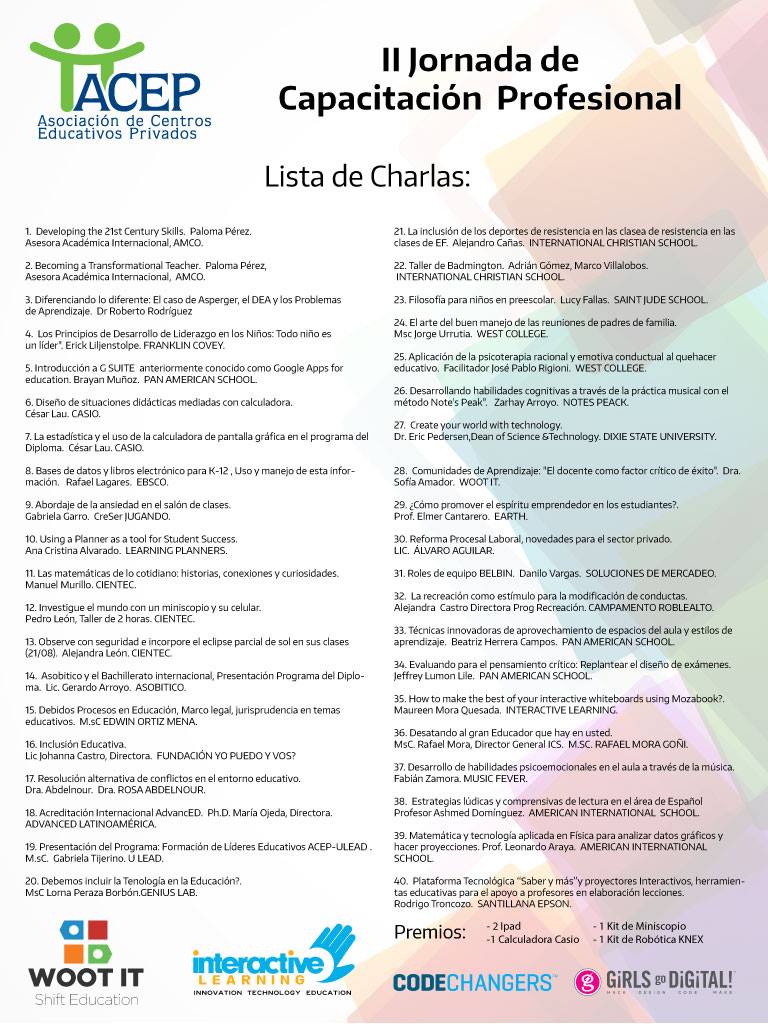 Con charlas sobre "Matemáticas de lo cotidiano", "Cómo utilizar el Eclipse para motivar y profundizar en ciencias", así como un taller sobre "Investigación del Micromundo", y un Stand de venta de materiales, participará CIENTEC en la II Jornada de Capacitación Profesional de la Asociación de Centros Educativos Privados, ACEP. Esta Jornada se realizará el lunes 13 de Marzo 2017, de 8:00 am a 3:00 pm en el International Christian School.