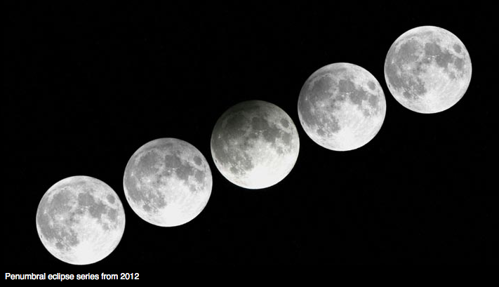 Se espera que la Luna se oscurezca un poco, del lado más cercano a la sombra oscura de la Tierra, la umbra. La siguiente serie de imágenes de un eclipse penumbral son del 2012 y muestran los cambios perceptibles, al colocar una secuencia de imágenes lunares de esa noche.
