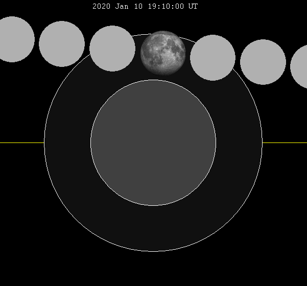 La primera Luna llena del 2020 sucede el 10 de enero en Costa Rica. Otras regiones verán la Luna esconderse detrás de la sombra penumbral de la Tierra, un velo sutil difícil de distinguir aún con telescopio mediano. No son fáciles los eclipses penumbrales. Imagen superior de Wikipedia.