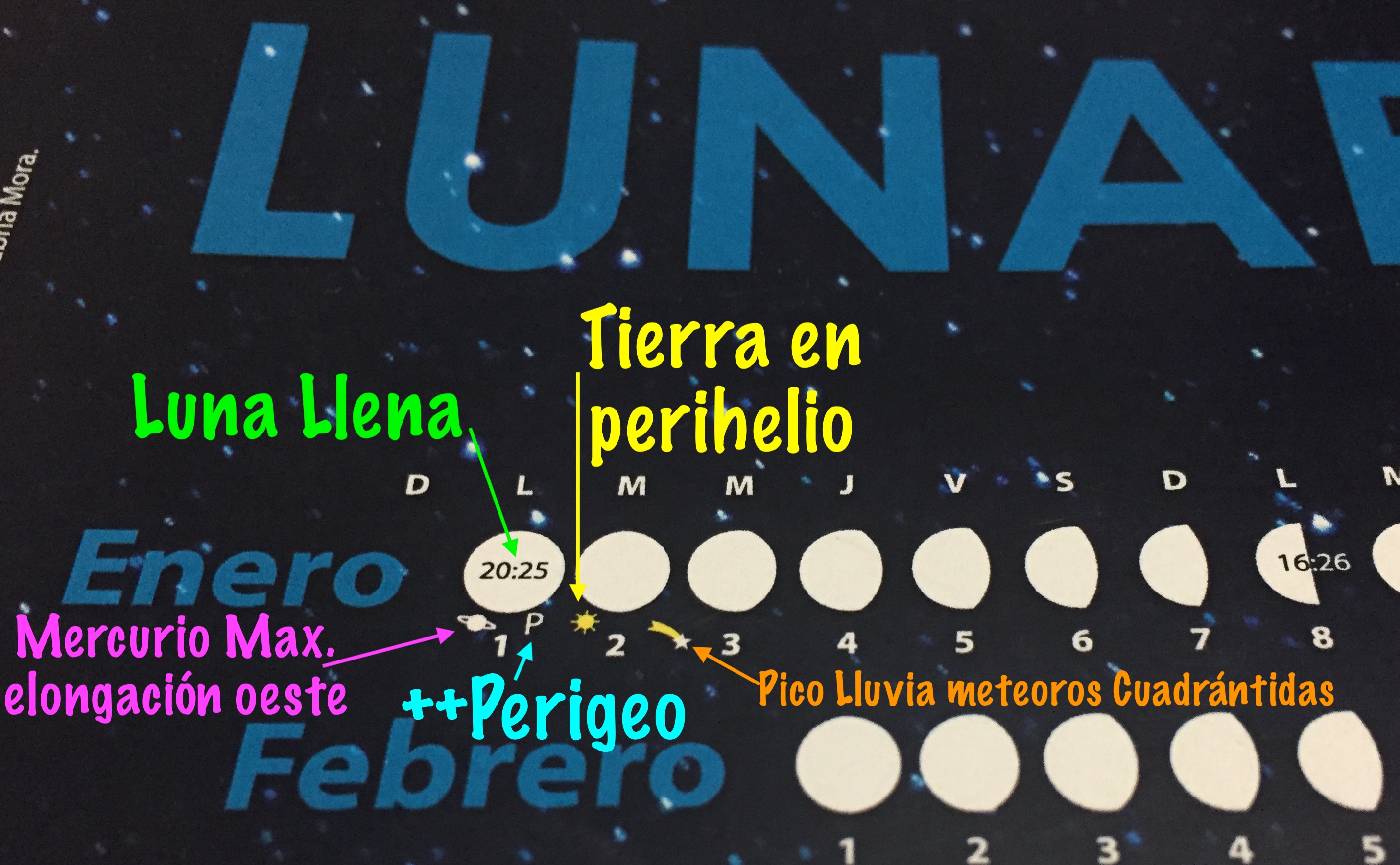 La Luna llena más cercana del año (++perigeo) será el 01 de enero y Mercurio alcanzará su máxima elongación oeste ese mismo día. Al día siguiente, el 02 de enero, la Tierra estará en perihelio, en su máxima aproximación Tierra-Sol del año. Ambos fenómenos, Luna en perigeo y Tierra en perihelio, contribuirán para generar mareas muy altas uno o dos días después.