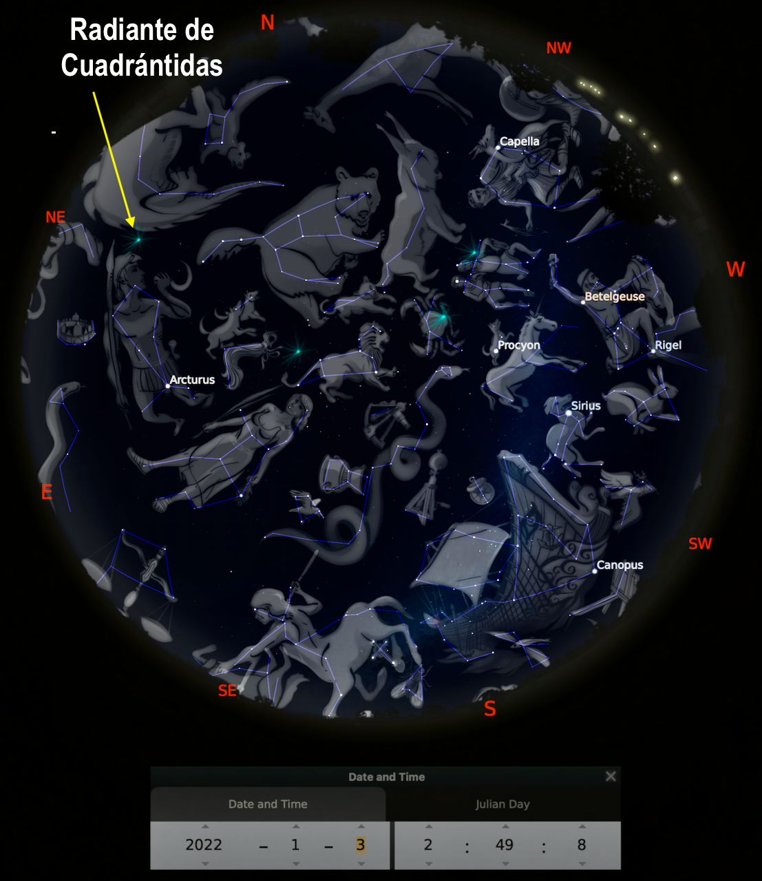Las madrugadas del 3 y el 4 de enero, la radiante de las Cuadrántidas sale por el Noreste alrededor de las 2:10 am.