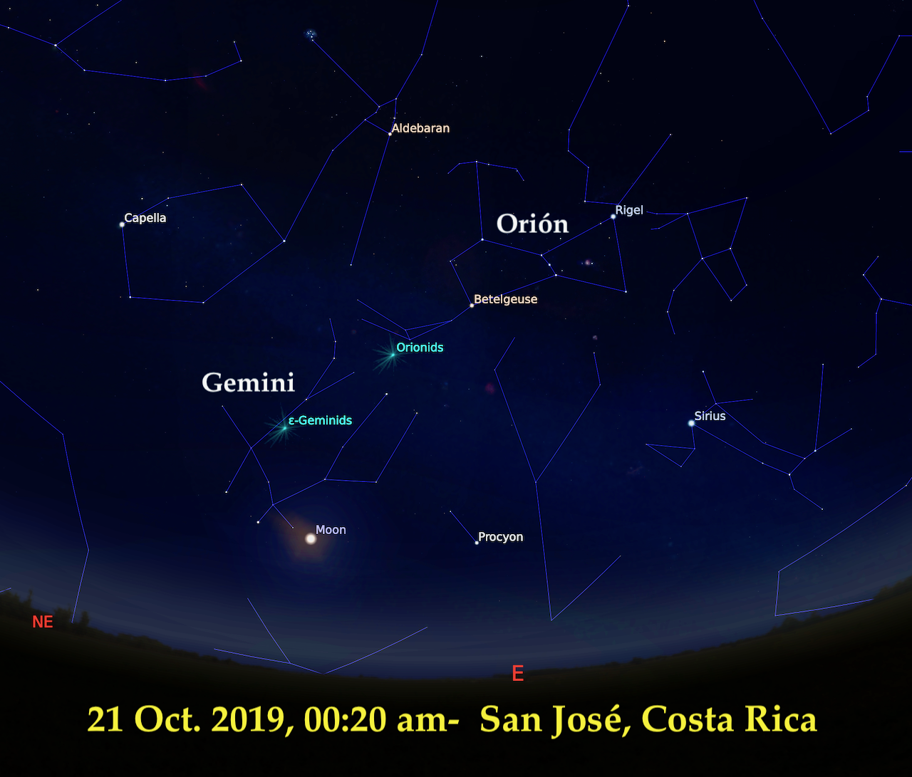 Este año, el máximo de las Oriónidas será la noche del 20 y el 21 de octubre. Lastimosamente, la Luna afectará su observación esa noche. Casi en Cuarto Menguante, la Luna se levanta a las 11 y 22 minutos de la noche, en la constelación vecina, Gémini. Su brillo afectará la observación del máximo de esta lluvia porque los rápidos meteoros y sus trazos son ténues.
