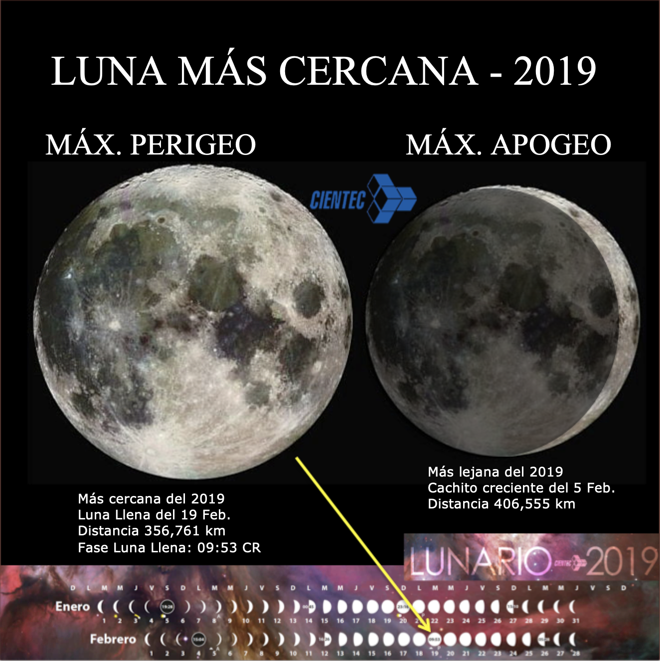 En su órbita elíptica alrededor de la Tierra, la Luna tiene un momento de mayor cercanía, llamado perigeo, y otro de mayor distancia, llamado apogeo. Estos dos datos se incluyen en el Lunario de CIENTEC porque son muy importantes al considerar las mareas, por ejemplo. El momento de Luna Llena de ese 19 de Feb. es a las 09:53 am para CR.