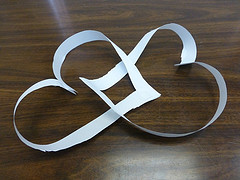 Una tercera idea, fácil y casi mágica, es construir unos corazones de bandas Moebius. Aquí hay un video muy fácil de seguir.