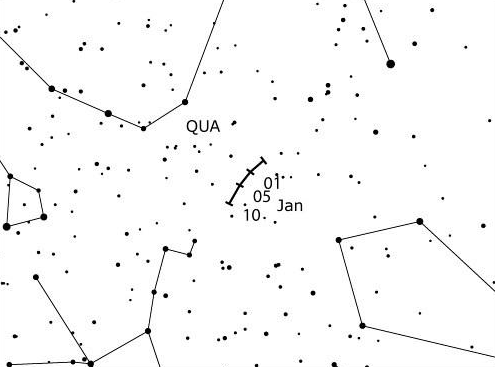Las Cuadrántidas se extienden entre el 28 de Dic. y el 10 de enero. Aunque su radiante está en Boyero, conserva el nombre de una constelación antigua, Quadrans Muralis. Es la única de las lluvias de estrellas fugaces que no se modernizó, en cuyo caso se llamaría Boyéridas. Sus meteoros entran en la atmósfera terrestre con velocidades de 41 m/s, considerada velocidad promedio entre otras lluvias, sin embargo, son de las más brillantes, con bólidos ocasionales.