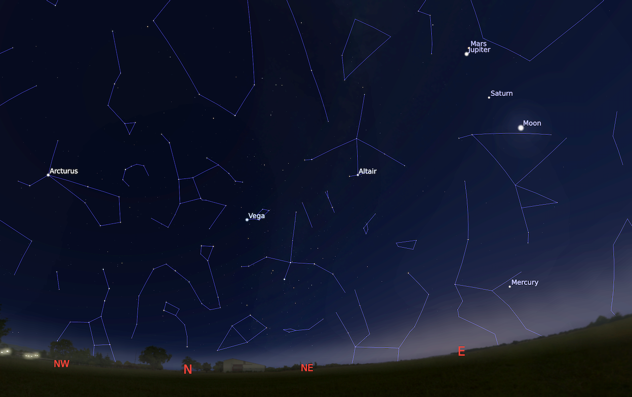 En estos días, los planetas están fáciles de divisar. Tal vez para encontrar Mercurio se necesiten binoculares, pero para los demás no será necesario. Se pueden identificar a simple vista por su brillo y coloración. Claro que ver con telescopio los satélites de Júpiter y el anillo de Saturno es espectacular, pero también podemos disfrutarlos a ojo desnudo.