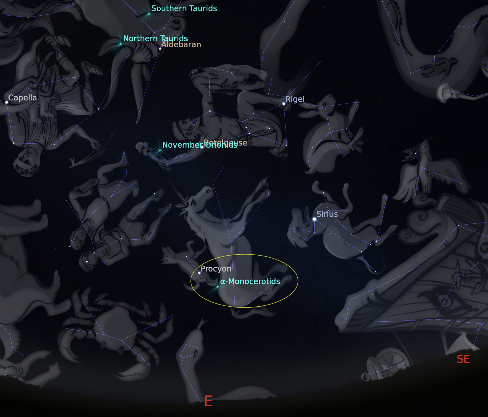 La lluvia de meteoros se llama así porque las partículas parecen irradiar de una región cercana a la estrella alfa de la constelación Monoceros, el unicornio. Esta es una constelación tenue que se encuentra rodeada por el Can Menor, Gémini, Orión, el Can Mayor, Lepus y otras.