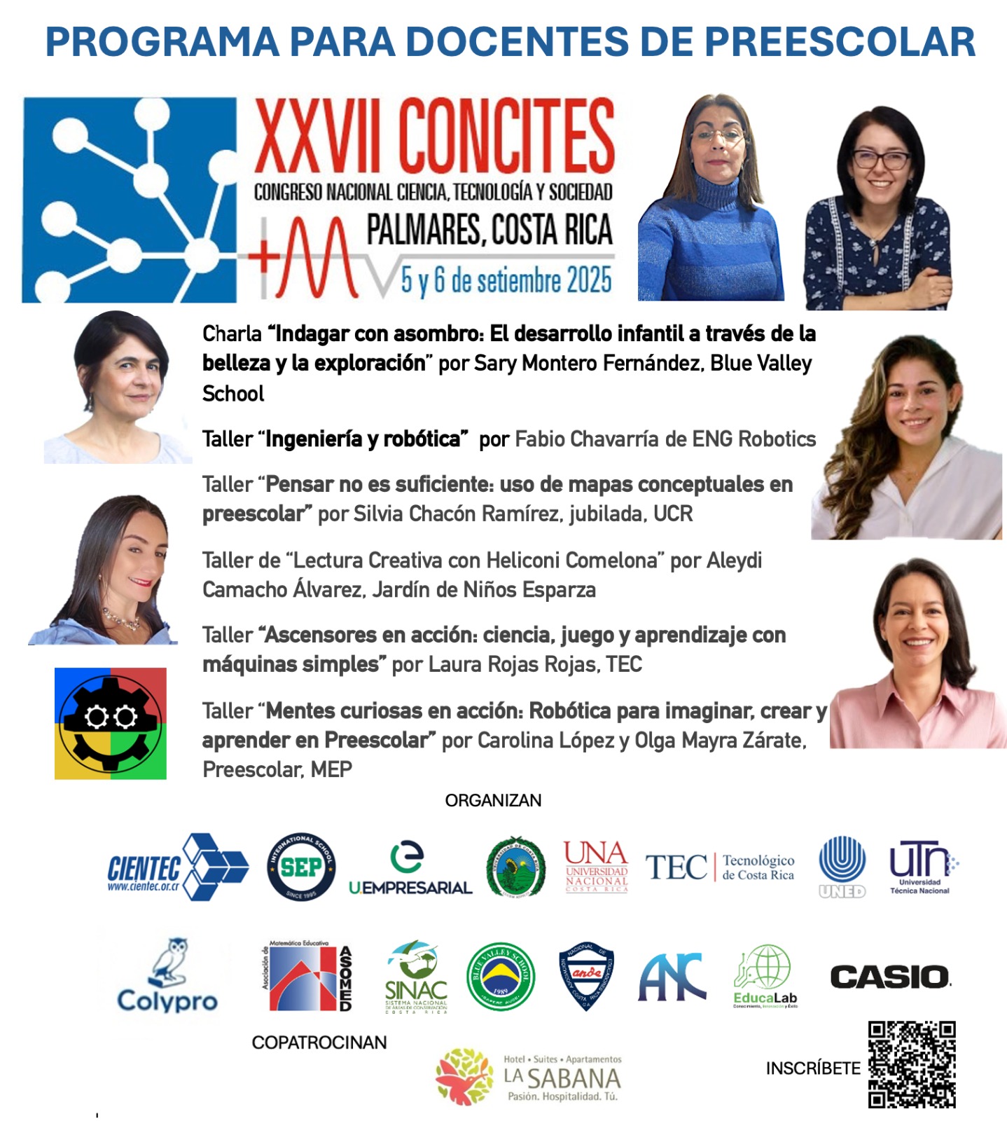 Profesionales en el campo de "primera infancia" serán parte de los más de 100 ponentes en el XXVII Congreso Nacional de Ciencia, Tecnología y Sociedad +Matemáticas de primaria. El encuentro se desarrollará la tarde del viernes 5 y el sábado 6 de Sept. en el SEP International School y U Empresarial en Palmares, Alajuela.