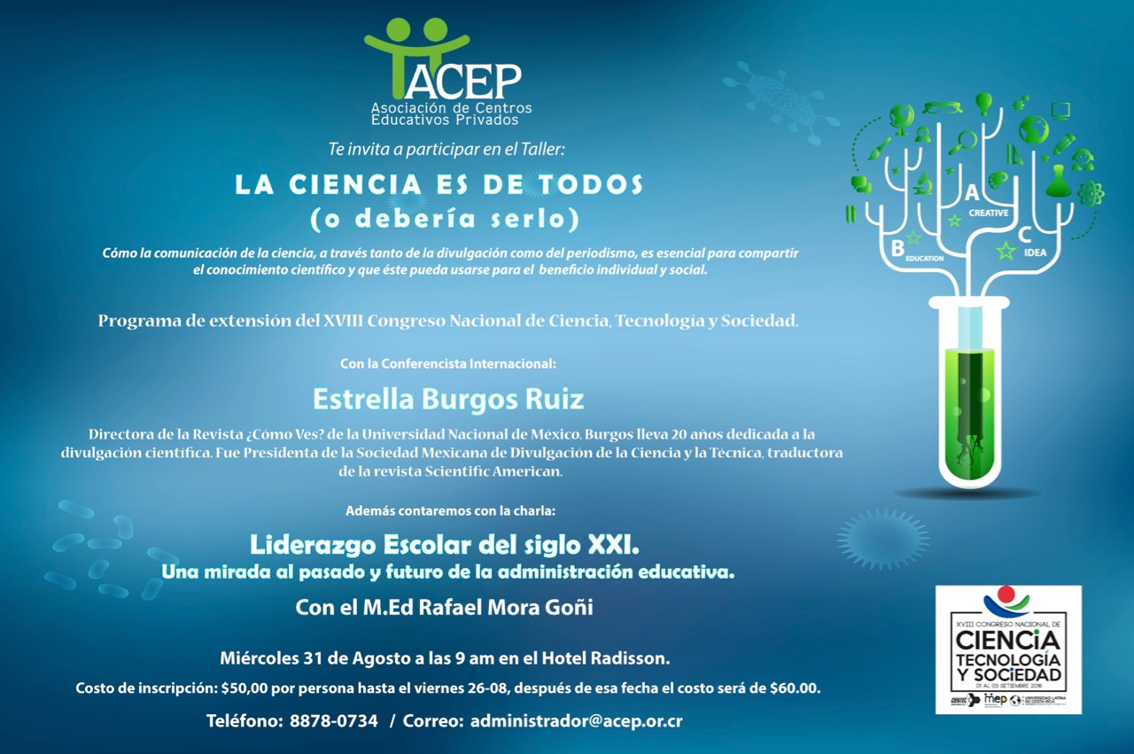 La invitada especial de la ACEP para impartir el taller "La ciencia es de todos (o debería serlo)" es especialista en comunicación de la ciencia y directora de la Revista ¿Cómo Ves?, Estrella Burgos. El evento está abierto a instituciones afiliadas de ACEP el miércoles 31 a las 9 am en el Hotel Radisson, en San José.