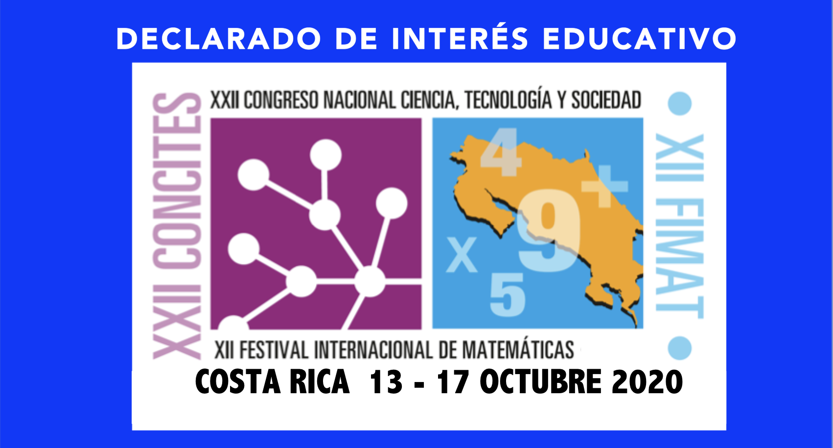 XII FIMAT y XXII CONCITES se realizarán en desde Costa Rica, iniciando el martes 13 de octubre y finalizando el 17 de octubre 2020. El programa ofrecerá la gama tradicional de actividades paralelas realizadas en los congresos de CIENTEC, desplegadas en formato: conferencia, taller, laboratorio, mesas redondas, sesión de poster y sesión comercial. El domingo 18 se ofrecerá un abanico de giras educativas adicionales, como opción para seguir aprendiendo de manera vivencial. La inscripción a las giras se realizará separadamente.