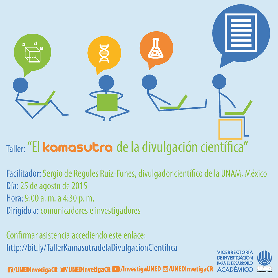 9 AM a 4:30 PM. Taller "El Kamasutra de la divulgación de la ciencia" por SErgio de Regules, UNAM, en la UNED. 2PM Conferencia por Martín Bonfil, "La Luz y la vida", Auditorio INIE, UCR. Liberia, Sede Chorotega, Taller con Modesto Tamez. |