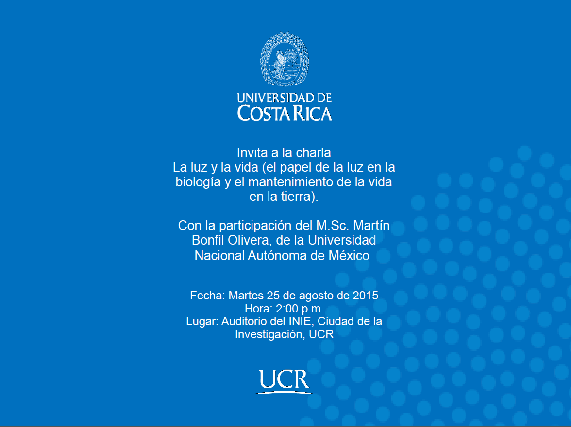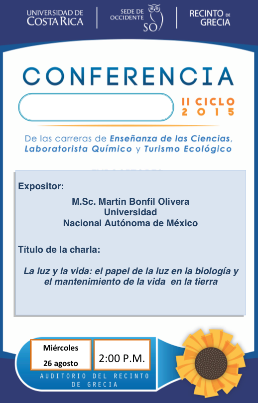 2PM Confernencia La Luz y la vida por Martín Bonfil, UNAM, en Recinto de Grecia, UCR. |