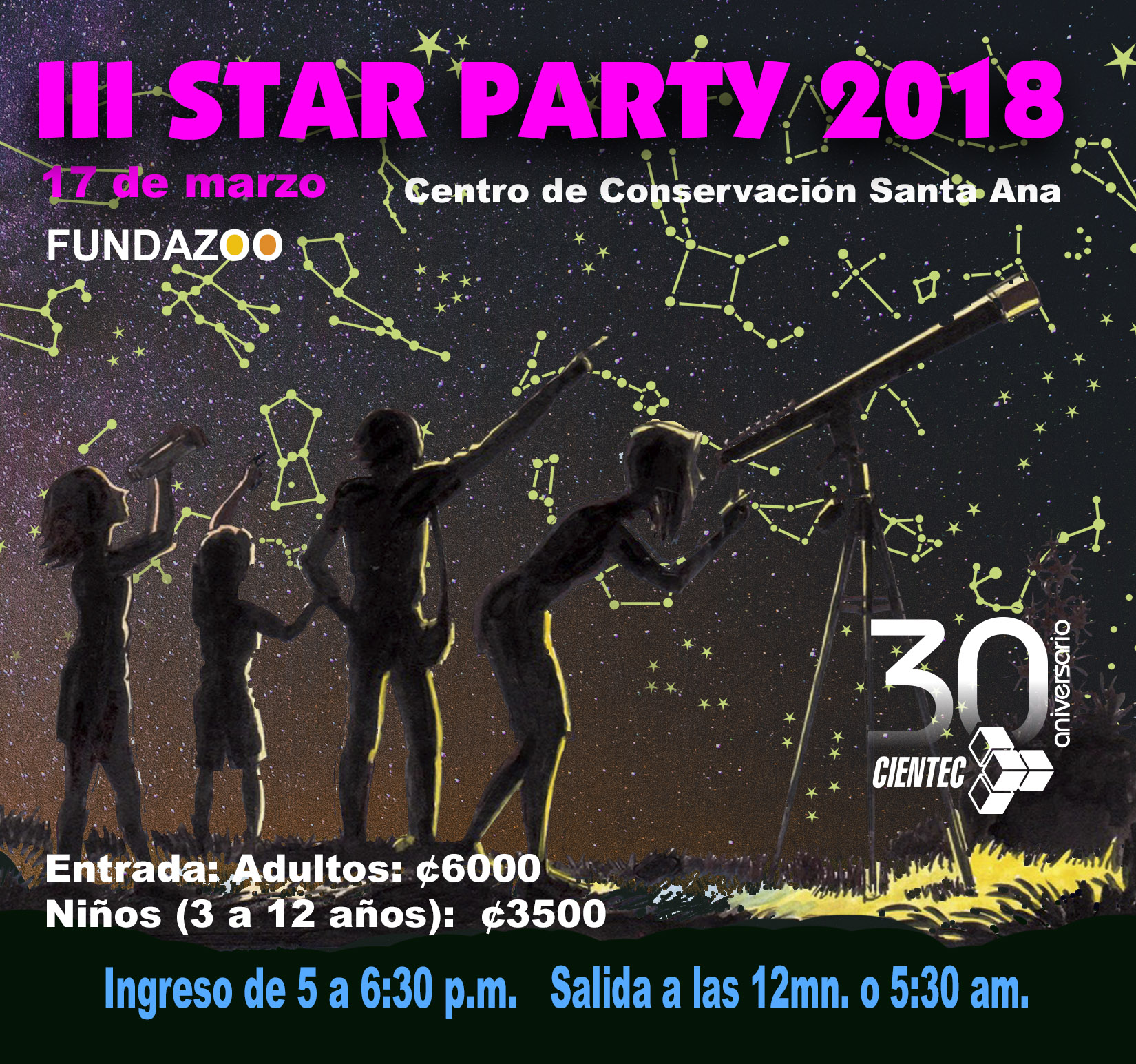 Esta es la tercera Fiesta de Estrellas- III Star Party- que organiza CIENTEC para el 2018 y se realizará el sábado 17 de marzo en el Centro de Conservación Santa Ana.