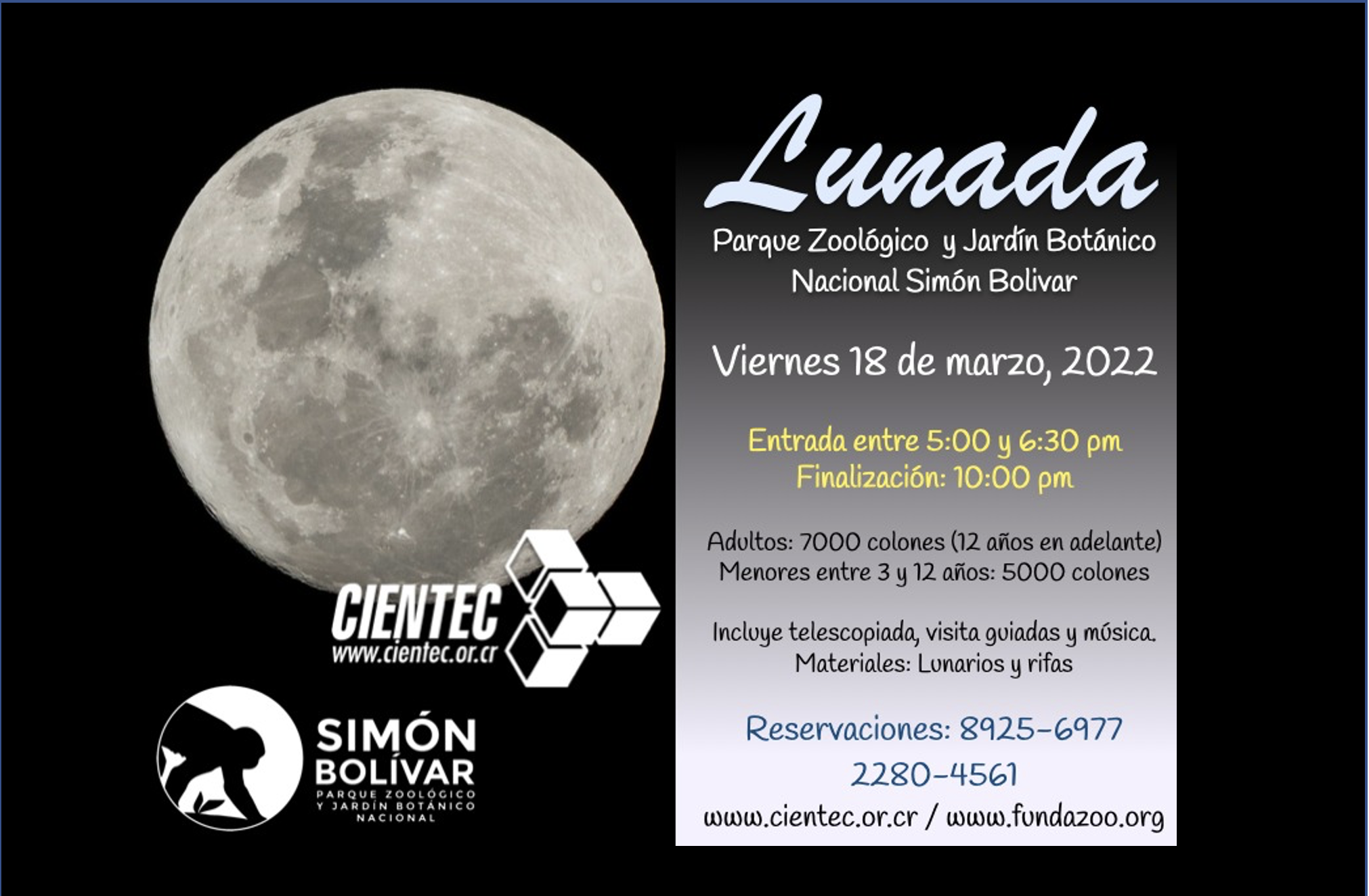 Se cerró el formulario de inscripción previa de la Lunada del 18 de marzo, pero todavía tenemos campo y puede pagar sus entradas en la boletería.SITIO: Zoológico Nacional Simón Bolívar. San José, del quiosco del Parque Morazán 300 metros al norte y 175 metros al noreste, Barrio Amón. |