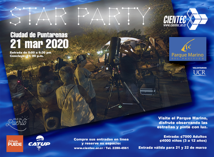 ¡Una oportunidad en la ciudad de Puntarenas! La Fundación CIENTEC y el Parque Marino del Pacífico organizamos un Star Party el sábado 21 de marzo en el Parque.