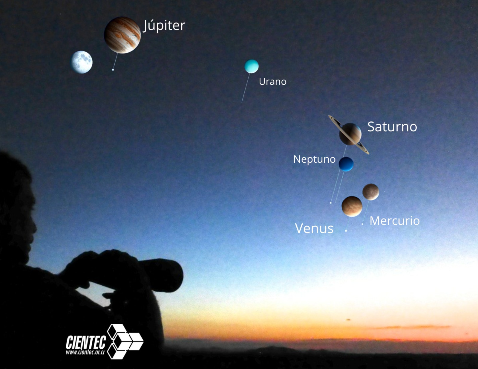 Empezaremos la observación con los colores del atardecer para despedir al Sol y buscaremos los 6 planetas empezando con los más cercanos al horizonte, Venus y Mercurio, porque se acuestan primero. Neptuno será enfocado con telescopio, que luego pasaremos a Saturno. Urano está cerca de Saturno pero solo con telescopio se puede distinguir. Mientras tanto, se irá oscureciento y aparecerán los primeros luceros. Veremos pasar los satélites artificiales. Seguirá, Júpiter más alto en el cielo, que podremos ver durante la noche. La Luna gibosa será otro de los objetos principales para motivar la observación del Eclipse Total de Luna del 3 de marzo.